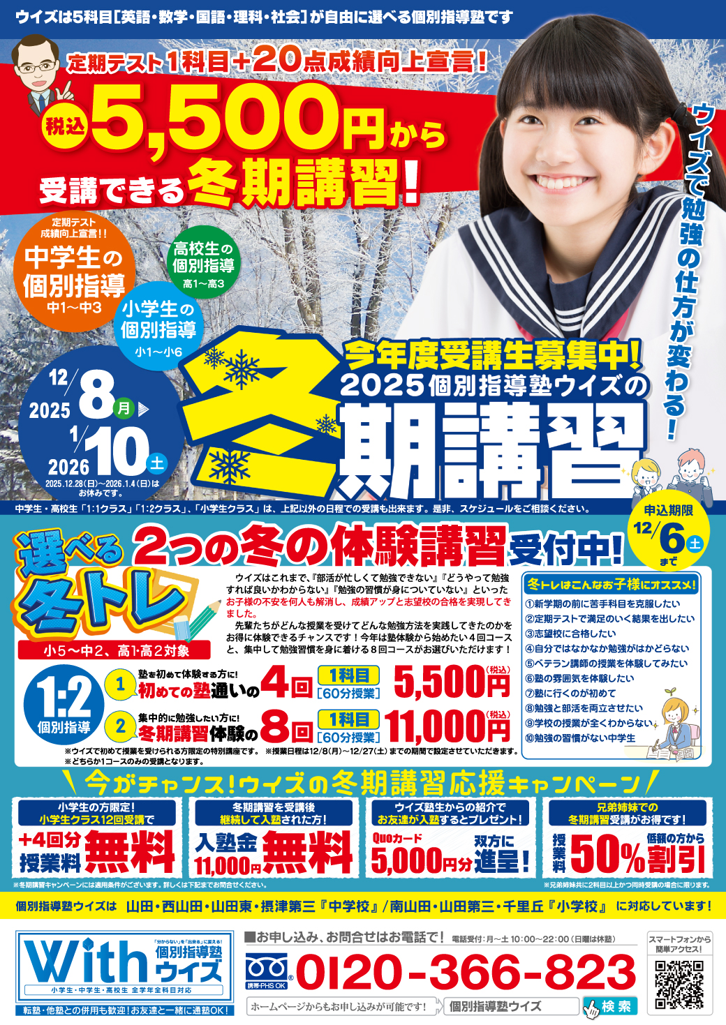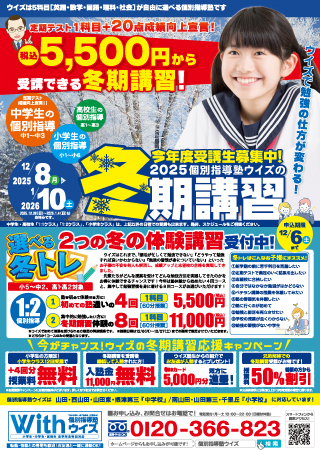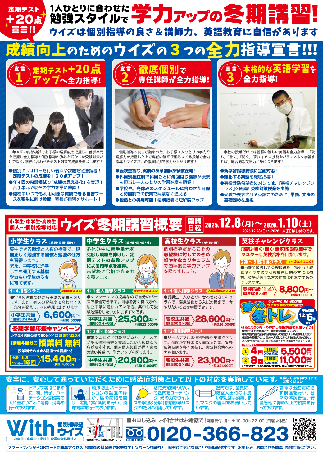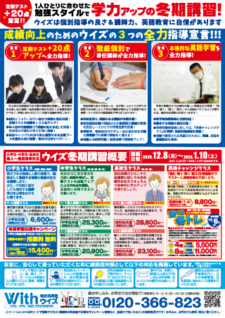 「手軽に出来る」「コロナウイルス対策のため」と、近頃はオンライン授業を行う塾が増えております。また、授業を動画で見るだけの教材も流行りつつありますが、ウイズは成績向上と、一人ひとりの習熟度の把握のため、対面しての個別指導にこだわり、安全・安心を重視した教室づくりで授業を行っております。 お近くにお住いの方は、是非チラシをご覧ください。